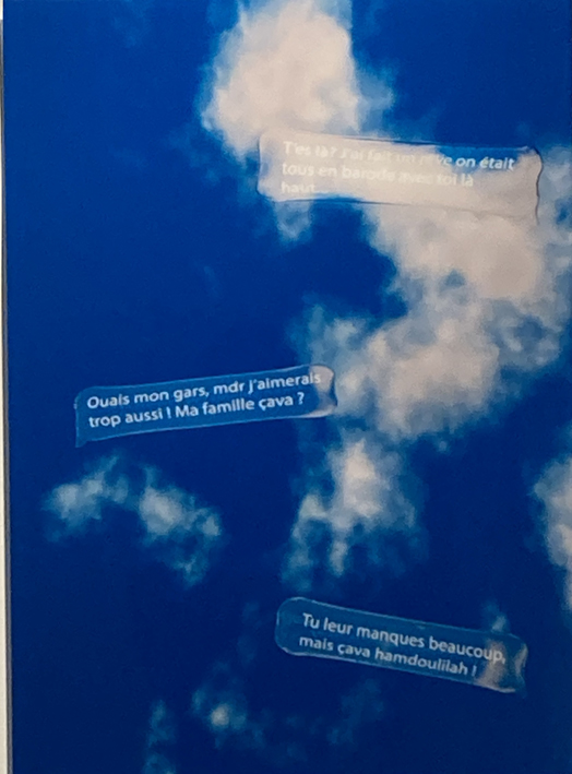 À partir d’une recherche iconographique sur la pratique du cabrage de moto, plus communément appelée « roue arrière », Samir Laghouati-Rashwan investit d’un point de vue sociologique et anthropologique ce sport urbain non-officiel. En créant une imagerie inédite, actualisant dans le présent une longue histoire de figures masculines exprimant divers registres du pouvoir dans le cabrage d’un cheval, il dépasse les répartitions genrées et stéréotypées, pour approcher une histoire invisibilisée, celle des femmes cavalières, des hommes non-occidentaux et issus des diasporas. Par l’articulation du texte et de l’image, il invente une forme inédite issue du roman photo. Dans ces bulles de conversation s’affichant dans le ciel s’exprime la mémoire de vies oubliées, s’arrachant à la pesanteur terrestre.
