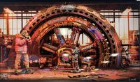 À gauche de la composition, l’artiste représente les buildings de Hong- Kong et les toits de Séoul, vus à travers les fenêtres d’un wagon.