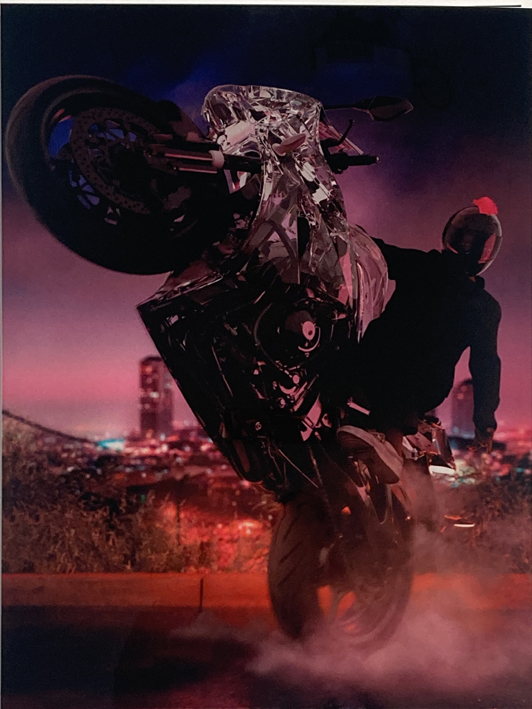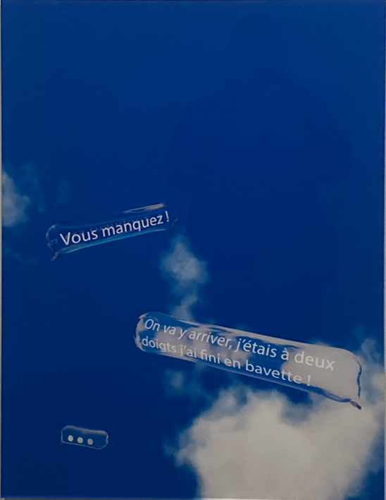 À partir d’une recherche iconographique sur la pratique du cabrage de moto, plus communément appelée « roue arrière », Samir Laghouati-Rashwan investit d’un point de vue sociologique et anthropologique ce sport urbain non-officiel. En créant une imagerie inédite, actualisant dans le présent une longue histoire de figures masculines exprimant divers registres du pouvoir dans le cabrage d’un cheval, il dépasse les répartitions genrées et stéréotypées, pour approcher une histoire invisibilisée, celle des femmes cavalières, des hommes non-occidentaux et issus des diasporas. Par l’articulation du texte et de l’image, il invente une forme inédite issue du roman photo. Dans ces bulles de conversation s’affichant dans le ciel s’exprime la mémoire de vies oubliées, s’arrachant à la pesanteur terrestre.